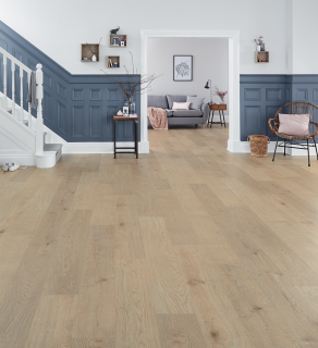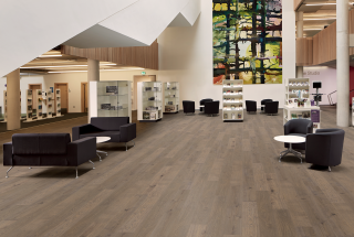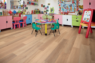 Gamme de LVT rigide doté d'un système d’emboîtement vertical par clic 5G haut de gamme, et d'un revêtement en mousse acoustique préalablement fixé, pour une installation rapide et facile.